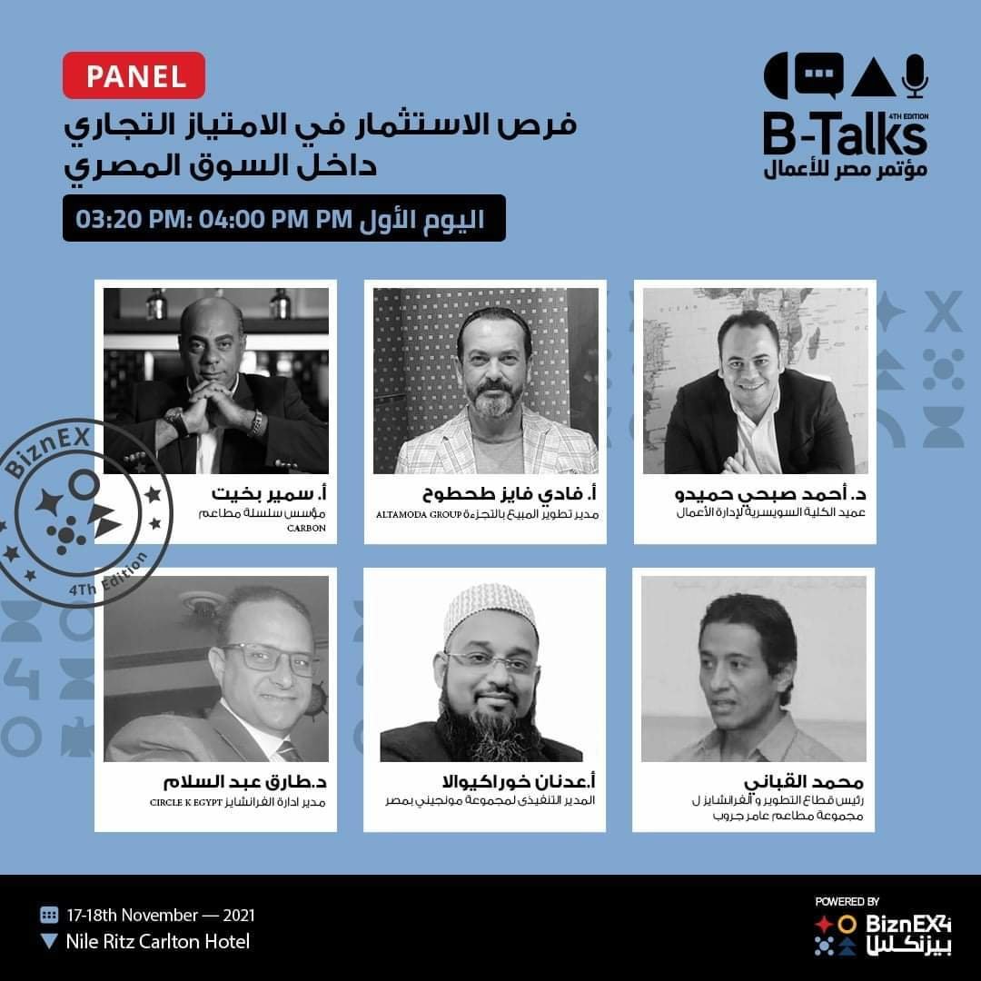 يناقش مؤتمر مصر للأعمال B-talks و المنعقد ضمن فعاليات معرض بيزنكس يوم ١٧ نوفمبر الجاري الاستثمار في مجال الامتياز التجاري و دوره في دفع عجلة الاستثمار الوطنية كما يعرض أيضا المؤتمر أهم فرص الفرنشايز المتاحة في السوق المصرية و هو ما يعد فرصة لرواد المعرض لمعرفة كافة العلامات التجارية المتاحة للفرنشايز في مصر