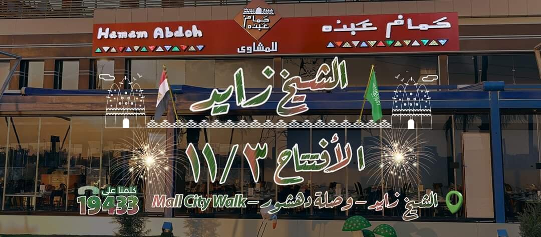 أعلنت مطاعم حمام عبده مصر عن افتتاح فرعها الثاني الخمیس الثالث من نوفمبر في وصلة دھشور الشیخ زاید مول سيتي متخذا شعاراً "من الرياض للكنانة حمام عبده حاجز مكانه في قلوب كل الناس" ويتميز الفرع الجديد بموقعه وديكوراته الجذابة .