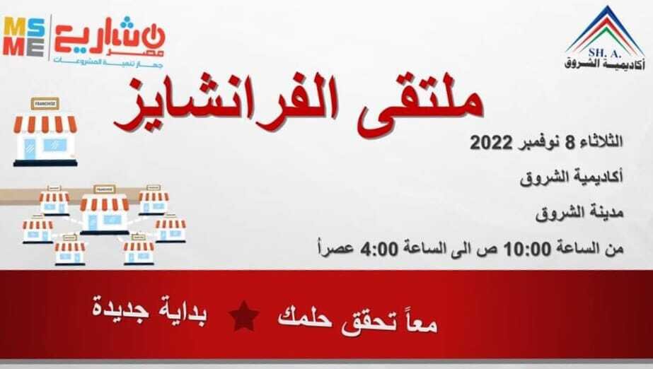 ينظم جهاز تنمية المشروعات بالتعاون مع أكاديمية الشروق يوم الثلاثاء الثامن من نوفمبر ملتقى الامتياز التجاري وذلك بكلية الإعلام ، ومشاركة مجموعة من الشركات مانحة حق استغلال العلامة التجارية منها سيفتى تك ،شهد للدواجن ،مكتبات برناسوس،الشركة المصرية للخدمات (خدماتي)،شاورما الريم ،البان المالكي ،فوري ،الهلال والنجمة الفضية ،فوود هب (باستا تو جو) ،كاروزوس ،أميريكان كافيه ،زينو كافيه،وان ستوب (خدمات صيانة سريعة للسيارات).