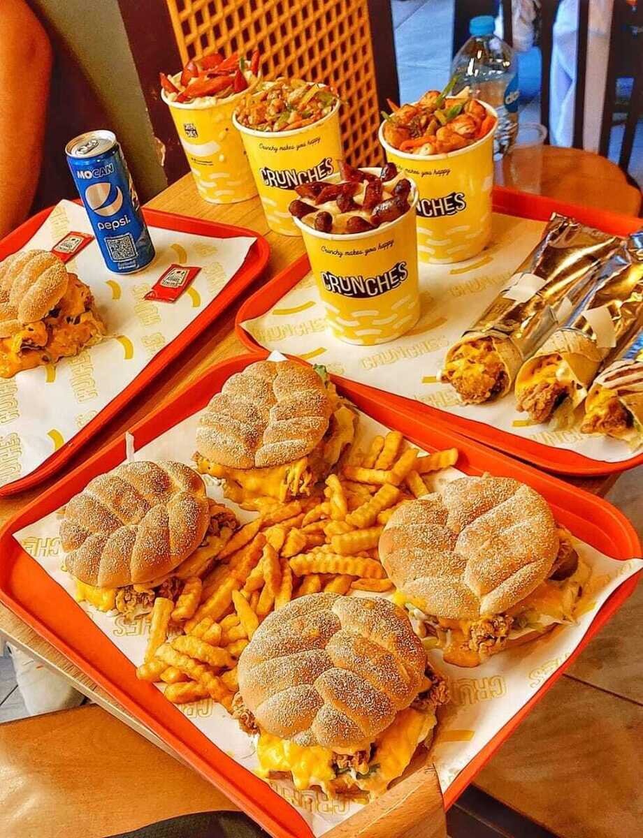 تتنوع قائمة كرانشز ما بين الفرايد تشيكن ومنها زنجر سوبريم وتشيكن راب ومكسيكن هوت دوج راب وكرامشي باستر والأستربس وفاهيتا سوبريم وكرانشى بانش والعديد من وجبات الفرايد تشيكن ومنها الخاصة بالأطفال ، وكذلك يقدم الباستا بأنواع متعددة منها باستا بالصوص سادة وأخرى بالصوص والخضروات وباستا بالسجق وباستا دجاج كرسبي وباستا بيف مدخن وباستا دجاج فاهيتا وباستا تركي مدخن وباستا ميكس لحوم وغيرها العديد من أصناف الباستا كما يقدم طاسات جبن متنوعة منها الجمبري ومكيس الجبن والتركي المدخن ومكسيكانو وميكس اللحوم.
