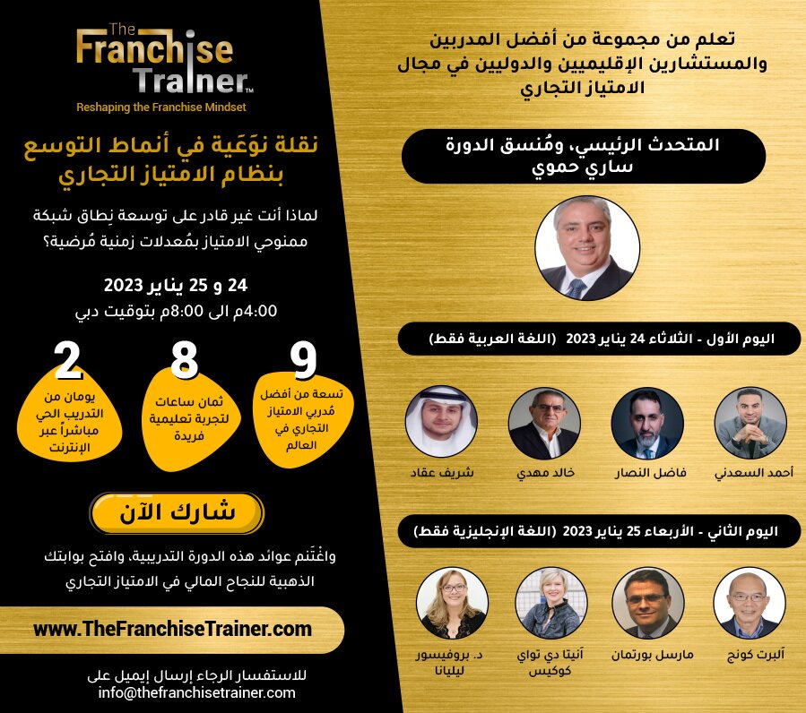 تقيم فرنشايز ترينر دورة تدريبية رقمية نوعية بعنوان نقلة نوعية في أنماط التوسع بنظام الامتياز التجاري .ووفقا للمستشار ساري حموي المتحدث الرئيسي والمنسق للدورة فانها ستقام بمشاركة عدد من افضل المدربين والمستشارين في الامتياز التجاري وتم تصميمها لمساعدة المشاركين في تطوير إستراتيجية واقعية للتوسع من خلال أدوات ومنهجية إدارة التغيير لتحويل الأهداف والإجراءات التنظيمية للتعامل مع النمو المتوقع لأنشطة الامتياز التجاري.